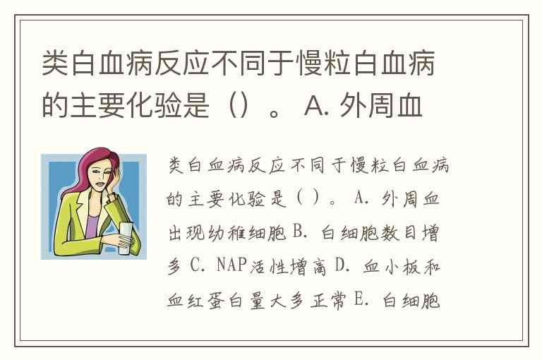 其他选项虽有差异但非特异性:外周血幼稚细胞比例(选项A)在慢粒常超过10%,类白血病反应多低于此值,但感染严重时可能重叠;白细胞数目增多(选项B)在两者均可出现,慢粒甚至可更高;血小板和血红蛋白水平(选项D)在类白血病反应中多正常,而慢粒晚期会降低,但早期可能无明显差异;中毒颗粒和空泡(选项E)仅见于粒细胞型类白血病反应,其他类型如淋巴细胞型则无此特征。相比之下,NAP活性检测不受样本采集时机或疾病阶段影响,具有稳定的鉴别价值。