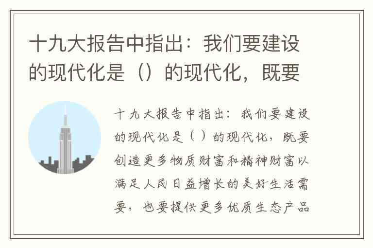 十九大报告中指出:我们要建设的现代化是()的现代化,既要创造更多物质财富和精神财富以满足人民日益增长的美好生活需要,也要提供更多优质生态产品以满足人民日益增长的优美生态环境需要。 A. 人与自然和谐共生 B. 人与环境和谐共生 C. 人与生态和谐共生