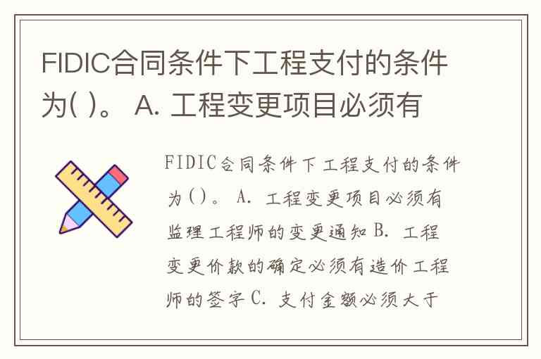 FIDIC合同条件下工程支付的条件为( )。 A. 工程变更项目必须有监理工程师的变更通知 B. 工程变更价款的确定必须有造价工程师的签字 C. 支付金额必须大于临时支付证书规定的最小限额 D. 设计变更必须由原设计单位出图 E. 承包商的工作使监理工程师满意