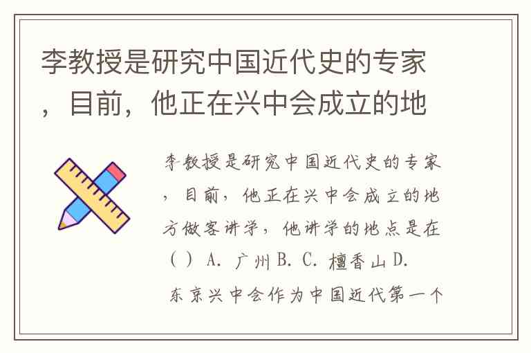李教授是研究中国近代史的专家,目前,他正在兴中会成立的地方做客讲学,他讲学的地点是在() A. 广州 B. C. 檀香山 D. 东京