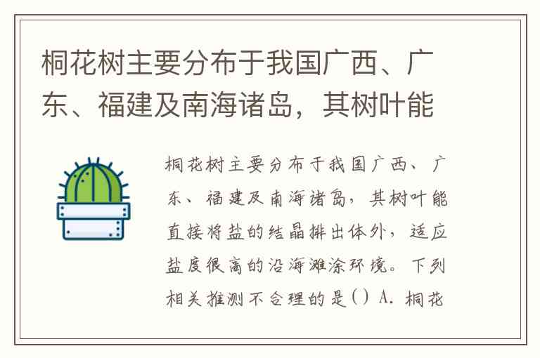 桐花树作为典型的红树林泌盐植物,其耐盐机制涉及根部过滤、叶片泌盐和渗透调节等多重策略。推测不合理的选项是 B. 桐花树根尖成熟区细胞的细胞液浓度低于土壤溶液。