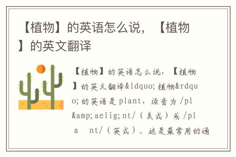 “植物”的英语是 plant,读音为 /plænt/(美式)或 /plɑːnt/(英式)。这是最常用的通用词汇,涵盖所有植物界生物,从微小的苔藓到高大的树木。