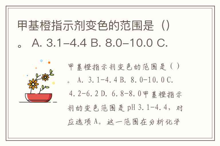 甲基橙指示剂变色的范围是()。 A. 3.1-4.4 B. 8.0-10.0 C. 4.2-6.2 D. 6.8-8.0