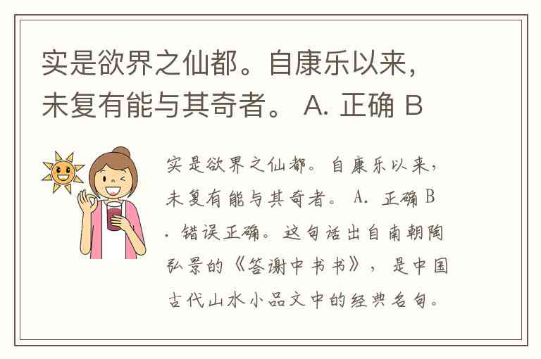 实是欲界之仙都。自康乐以来,未复有能与其奇者。 A. 正确 B. 错误