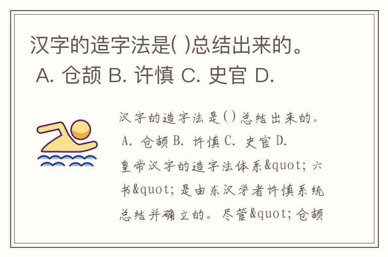 汉字的造字法是( )总结出来的。 A. 仓颉 B. 许慎 C. 史官 D. 皇帝