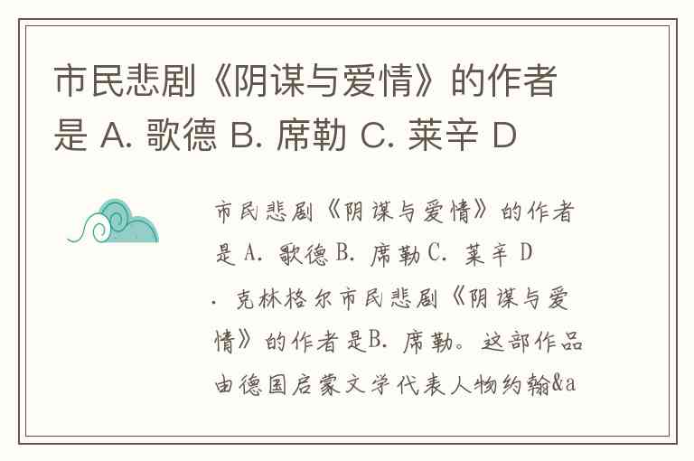 市民悲剧《阴谋与爱情》的作者是 A. 歌德 B. 席勒 C. 莱辛 D. 克林格尔