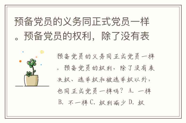 预备党员的义务同正式党员一样。预备党员的权利,除了没有表决权、选举权和被选举权以外,也同正式党员一样吗? A. 一样 B. 不一样 C. 权利减少 D. 权利增加