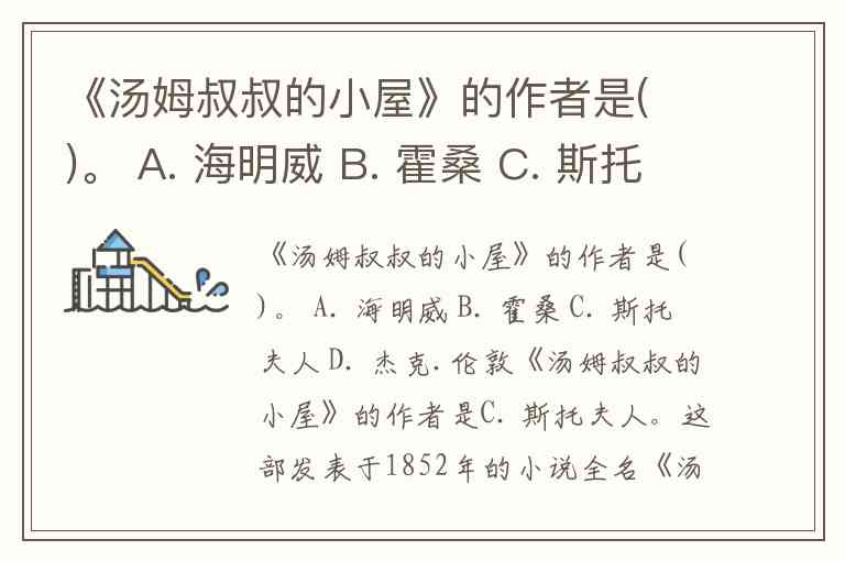 《汤姆叔叔的小屋》的作者是C. 斯托夫人。这部发表于1852年的小说全名《汤姆叔叔的小屋:卑贱者的生活》,由美国作家哈里特·比彻·斯托(Harriet Beecher Stowe)创作,是19世纪美国废奴文学的经典之作。小说通过描写黑奴汤姆的悲惨遭遇,深刻揭露了奴隶制的残酷本质,对美国内战前的废奴运动产生了深远影响。