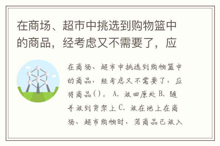 在商场、超市中挑选到购物篮中的商品,经考虑又不需要了,应将商品( )。 A. 放回原处 B. 随手放到货架上 C. 放在地上