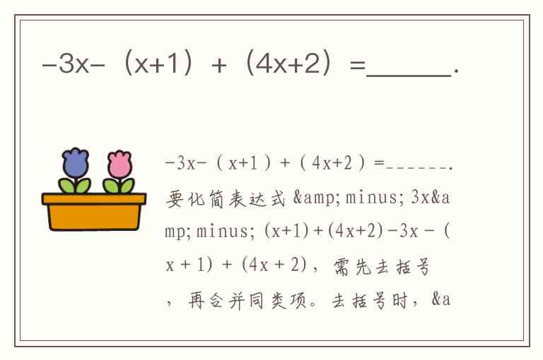 要化简表达式 −3x−(x+1)+(4x+2),需先去括号,再合并同类项。去括号时,−(x+1) 变为 −x−1,+(4x+2) 保持不变;随后合并含 x 的项和常数项: