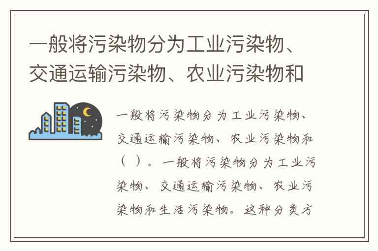 一般将污染物分为工业污染物、交通运输污染物、农业污染物和生活污染物。这种分类方式基于污染物的产生来源,能清晰反映人类活动对环境的不同影响途径。