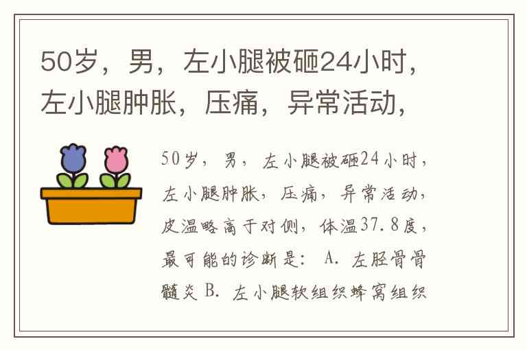 50岁,男,左小腿被砸24小时,左小腿肿胀,压痛,异常活动,皮温略高于对侧,体温37.8度,最可能的诊断是: A. 左胫骨骨髓炎 B. 左小腿软组织蜂窝组织炎 C. 左胫骨干骨折 D. 左小腿血肿 E. 左小腿软组织挫伤