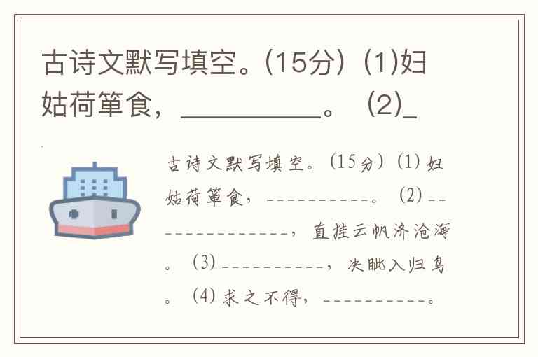 古诗文默写填空。(15分) (1)妇姑荷箪食,__________。 (2)______________,直挂云帆济沧海。 (3)__________,决眦入归鸟。 (4)求之不得,__________。 (5)______________,夜泊秦淮近酒家。 (6)__________,千骑卷平冈。 (7)春蚕到死丝方尽,______________。 (8)浊酒一杯家万里,______________。 (9)庭下如积水空明,______________,盖竹柏影也。 (10)无丝竹之乱耳,______________。 (11)土地平旷,________,有良田美池桑竹之属。 (12)苏轼在《水调歌头?明月几时有》中化用谢庄《月赋》中的“隔千里兮共明月”的句子是:“______________,______________。” (13)《酬乐天扬州初逢席上见赠》中蕴涵着新事物必然取代旧事物这一哲理的诗句是:“______________,______________。”
