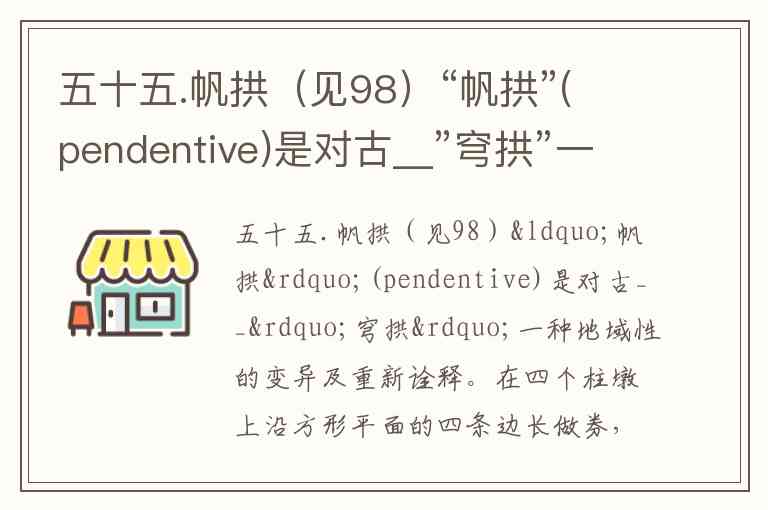 五十五.帆拱(见98)“帆拱”(pendentive)是对古__”穹拱”一种地域性的变异及重新诠释。在四个柱墩上沿方形平面的四条边长做券,在四个垂向券拱之间砌筑一个过四个切点的相切穹顶,水平切口和4个发券之间所余下的4个角上的球面三角形部分,既称为“帆拱”。它的自重完全由四个券拱下的柱墩承担,这一结构不仅使穹顶与方形平面的承接过渡在形式上自然简洁,也将荷载集中至四座柱墩上,而无需再要过渡的承重墙,从而使内部空间获得极大的自由。