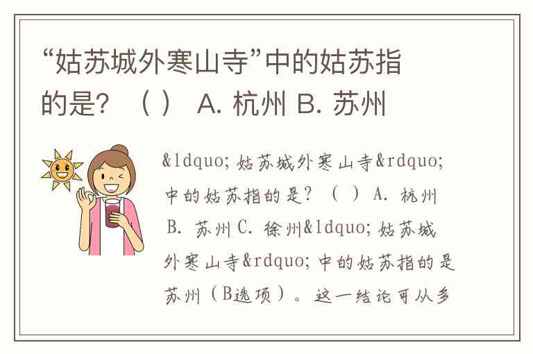 “姑苏城外寒山寺”中的姑苏指的是苏州(B选项)。这一结论可从多份资料中得到明确印证:寒山寺位于苏州市姑苏区,而“姑苏”正是苏州的古称。例如,知乎用户“不正经的老象”直接引用张继原诗并指出寒山寺在苏州姑苏区,而景区介绍也反复强调其地理位置为“江苏省苏州市姑苏区寒山寺弄24号”。