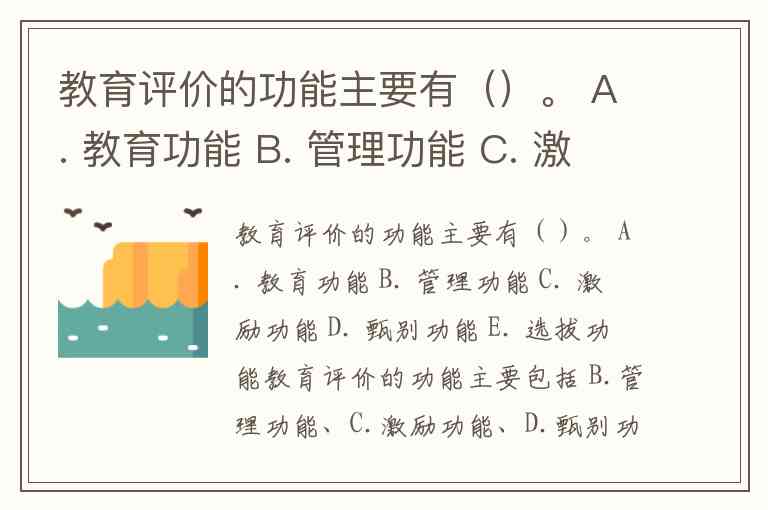教育评价的功能主要包括 B.管理功能、C.激励功能、D.甄别功能、E.选拔功能,其中甄别与选拔功能常被归为同一类。而 教育功能 并非学术界普遍认可的独立分类,通常被导向、诊断等功能涵盖。以下是具体解析: