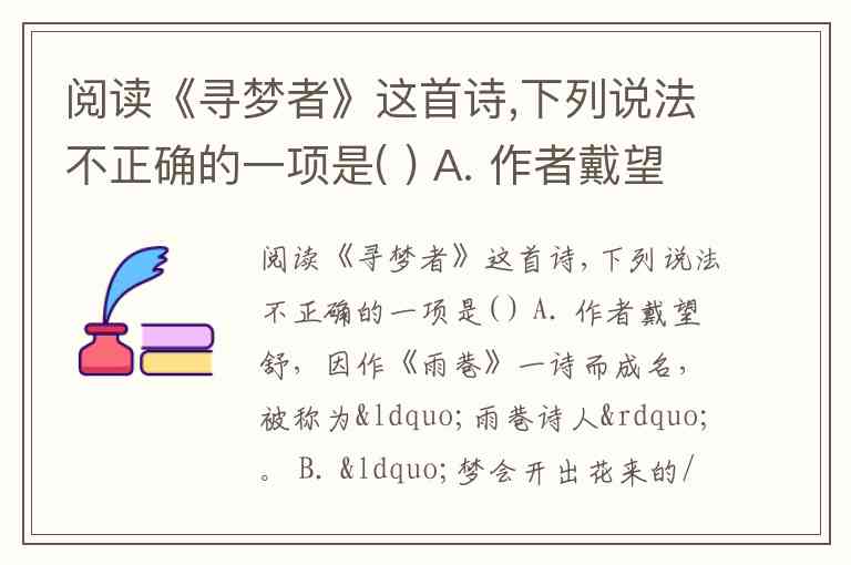 阅读《寻梦者》这首诗,下列说法不正确的一项是( ) A. 作者戴望舒,因作《雨巷》一诗而成名,被称为“雨巷诗人”。 B. “梦会开出花来的/梦会开出娇妍的花来的”,说明梦是美丽和绚丽的,如无价之宝般珍贵,值得人一生去寻求。 C. “在青色的大海里,在青色的大海的底里”,可见梦是“深藏”的,不易寻找的,所以不要去寻找。 D. 《寻梦者》以象征的手法告诉了人们一个人生的真谛:任何美好理想的实现、任何事业成功的获取,必须付出人一生追求的艰苦代价。 《