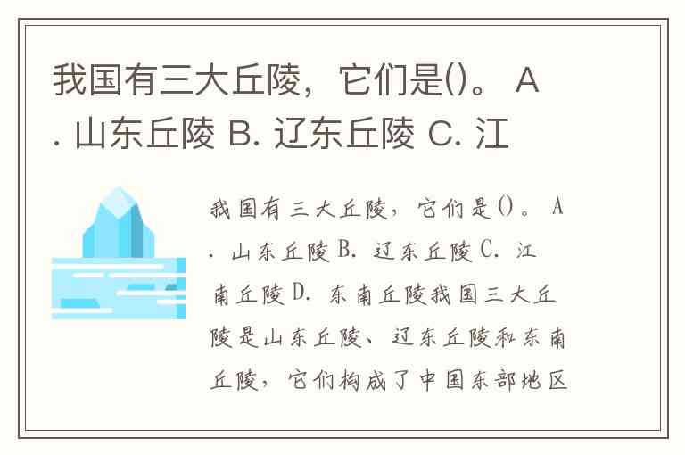 我国有三大丘陵,它们是()。 A. 山东丘陵 B. 辽东丘陵 C. 江南丘陵 D. 东南丘陵