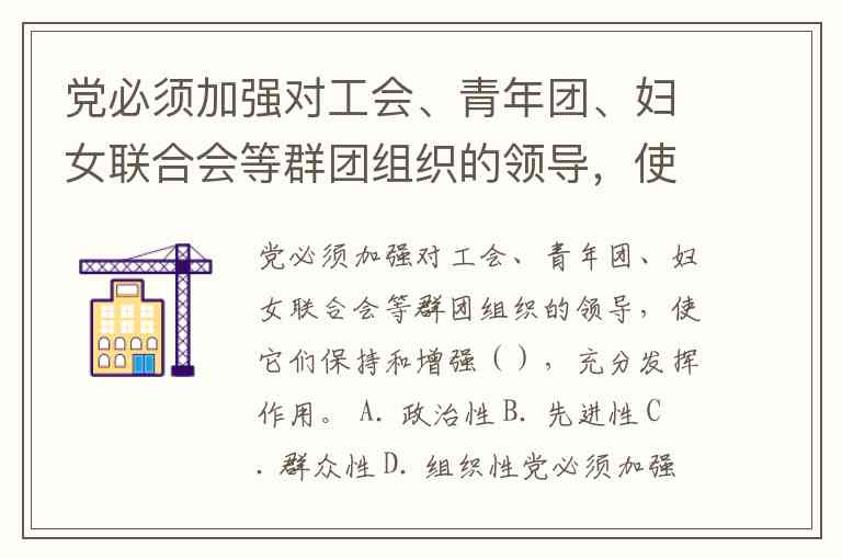 党必须加强对工会、青年团、妇女联合会等群团组织的领导,使它们保持和增强(),充分发挥作用。 A. 政治性 B. 先进性 C. 群众性 D. 组织性