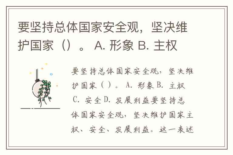 要坚持总体国家安全观,坚决维护国家()。 A. 形象 B. 主权 C. 安全 D. 发展利益