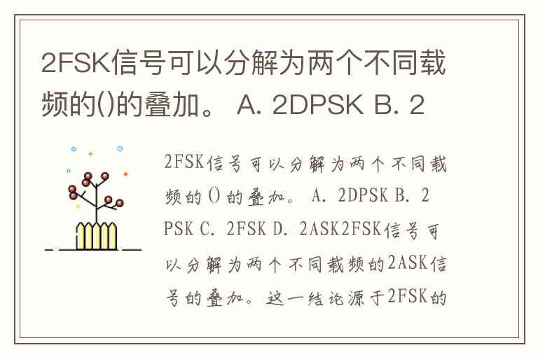 2FSK信号可以分解为两个不同载频的()的叠加。 A. 2DPSK B. 2PSK C. 2FSK D. 2ASK