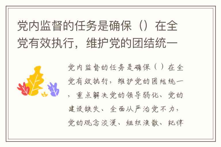 党内监督的任务是确保()在全党有效执行,维护党的团结统一,重点解决党的领导弱化、党的建设缺失、全面从严治党不力,党的观念淡漠、组织涣散、纪律松弛,管党治党宽松软问题,保证党的组织充分履行职能、发挥核心作用,保证全体党员发挥先锋模范作用,保证党的领导干部忠诚干净担当。 A. 党章 B. 党章党规 C. 党章党规党纪 D. 党章党纪