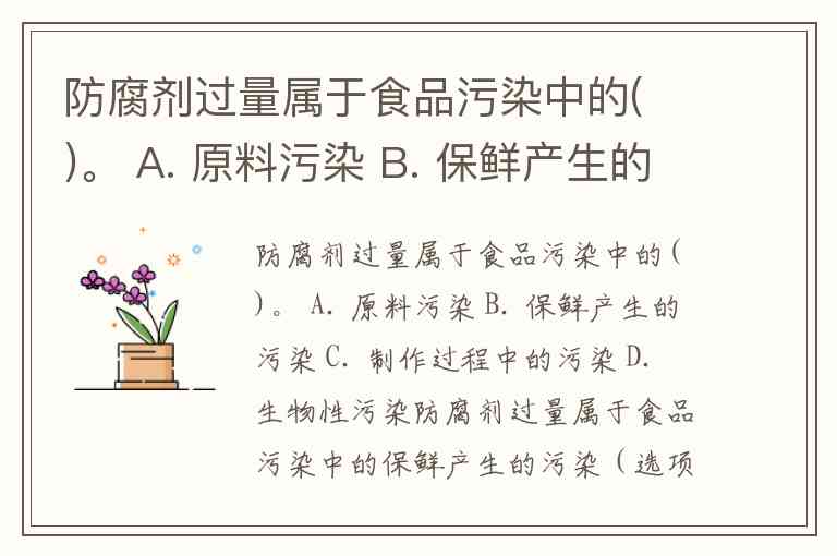 防腐剂过量属于食品污染中的( )。 A. 原料污染 B. 保鲜产生的污染 C. 制作过程中的污染 D. 生物性污染