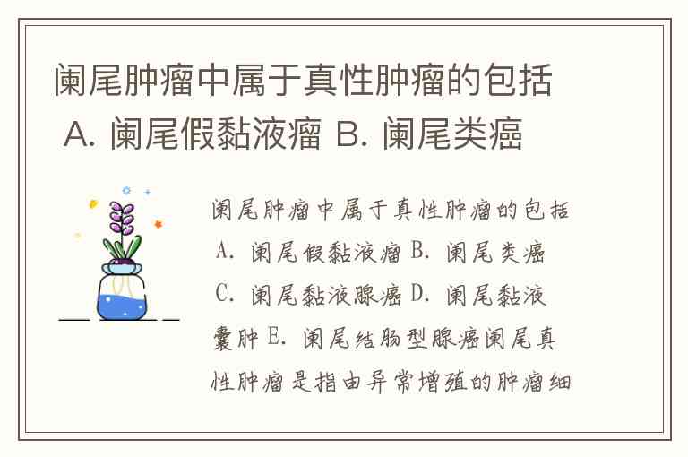 阑尾真性肿瘤是指由异常增殖的肿瘤细胞构成、具有明确恶性潜能或生物学行为的病变。在选项中,阑尾类癌(B)、阑尾黏液腺癌(C)和阑尾结肠型腺癌(E) 属于真性肿瘤,而阑尾假黏液瘤(A)和阑尾黏液囊肿(D)则不属于。以下是具体分析: