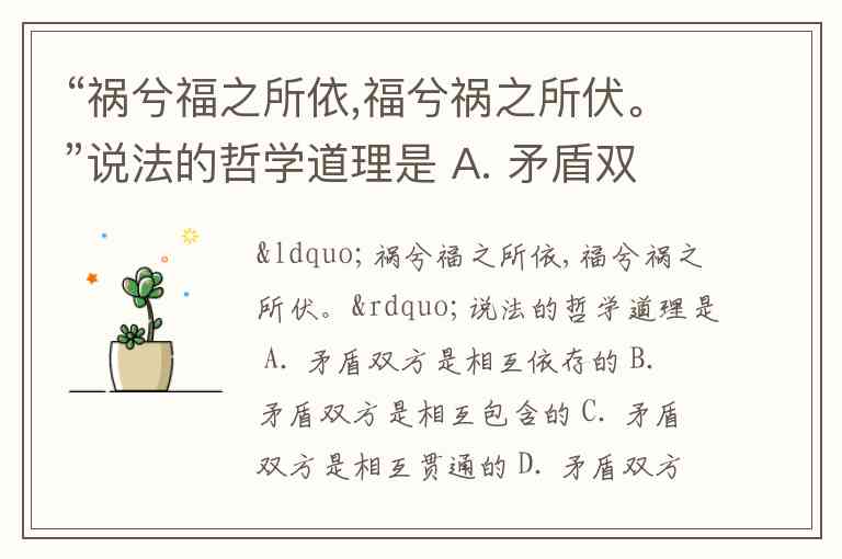 “祸兮福之所依,福兮祸之所伏。”说法的哲学道理是 A. 矛盾双方是相互依存的 B. 矛盾双方是相互包含的 C. 矛盾双方是相互贯通的 D. 矛盾双方是相互转化的