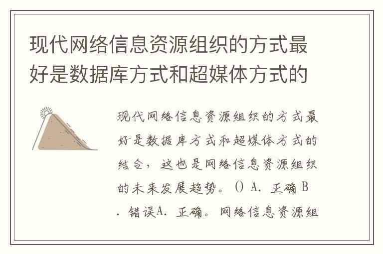 现代网络信息资源组织的方式最好是数据库方式和超媒体方式的结合,这也是网络信息资源组织的未来发展趋势。() A. 正确 B. 错误