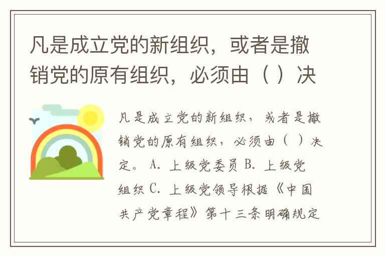 凡是成立党的新组织,或者是撤销党的原有组织,必须由( )决定。 A. 上级党委员 B. 上级党组织 C. 上级党领导