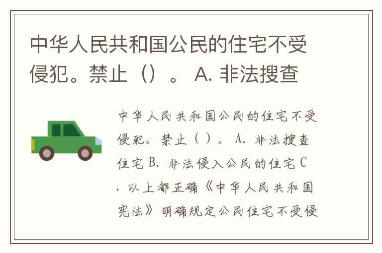 中华人民共和国公民的住宅不受侵犯。禁止()。 A. 非法搜查住宅 B. 非法侵入公民的住宅 C. 以上都正确