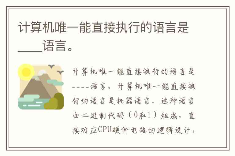 计算机唯一能直接执行的语言是机器语言。这种语言由二进制代码(0和1)组成,直接对应CPU硬件电路的逻辑设计,无需任何软件翻译即可被处理器执行。