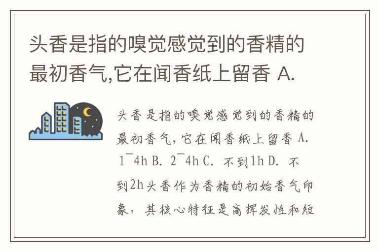 头香是指的嗅觉感觉到的香精的最初香气,它在闻香纸上留香 A. 1~4h B. 2~4h C. 不到1h D. 不到2h