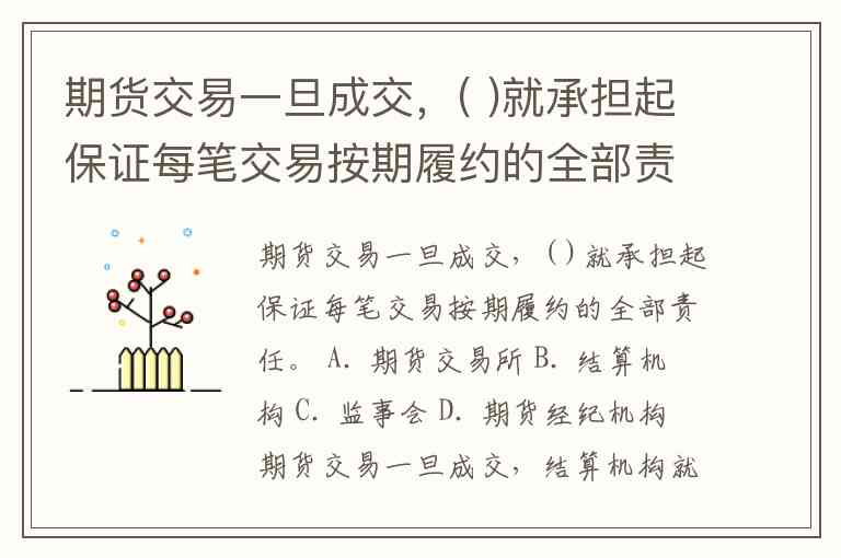 期货交易一旦成交,( )就承担起保证每笔交易按期履约的全部责任。 A. 期货交易所 B. 结算机构 C. 监事会 D. 期货经纪机构