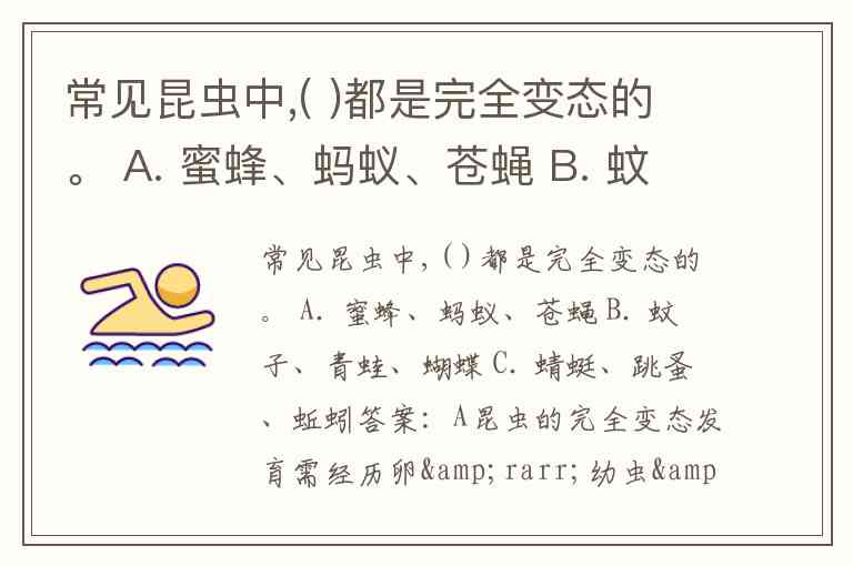常见昆虫中,( )都是完全变态的。 A. 蜜蜂、蚂蚁、苍蝇 B. 蚊子、青蛙、蝴蝶 C. 蜻蜓、跳蚤、蚯蚓