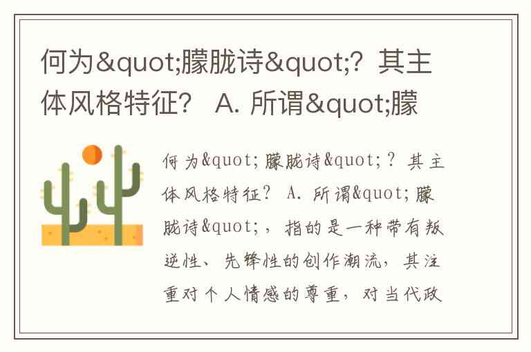何为"朦胧诗"?其主体风格特征? A. 所谓"朦胧诗",指的是一种带有叛逆性、先锋性的创作潮流,其注重对个人情感的尊重,对当代政治事件、社会思潮的反思和评说,艺术上多用总体象征,具有表达的多义性和不确定性,多表现复杂、多层次的主题世界。因情感表现的多向性和主题的多义性,代替了传统的线性因果思维或直抒胸臆方式,一些习惯""诗歌的评论者和读者感到难以理解,感到晦涩、朦胧,"朦胧诗"的名称便因此而来。 B. 所谓"朦胧诗",指的是一种带有现实性、象征性的创作潮流,其注重反思历史,批判主义和奴性人格,艺术上多用总体象征,具有表达的单一性和确定性,多表现复杂、多层次的主题世界。因情感表现的多向性和主题的多义性,代替了传统的线性因果思维或直抒胸臆方式,一些习惯""诗歌的评论者和读者感到难以理解,感到晦涩、朦胧,"朦胧诗"的名称便因此而来。 C. 所谓"朦胧诗",指的是一种带有叛逆性、先锋性的创作潮流,其注重反思历史,批判主义和奴性人格,艺术上多用总体象征,具有表达的多义性和不确定性,多表现复杂、多层次的主题世界。因情感表现的多向性和主题的多义性,代替了传统的线性因果思维或直抒胸臆方式,一些习惯""诗歌的评论者和读者感到难以理解,感到晦涩、朦胧,"朦胧诗"的名称便因此而来。