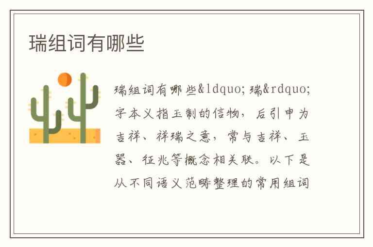 “瑞”字本义指玉制的信物,后引申为吉祥、祥瑞之意,常与吉祥、玉器、征兆等概念相关联。以下是从不同语义范畴整理的常用组词及示例: