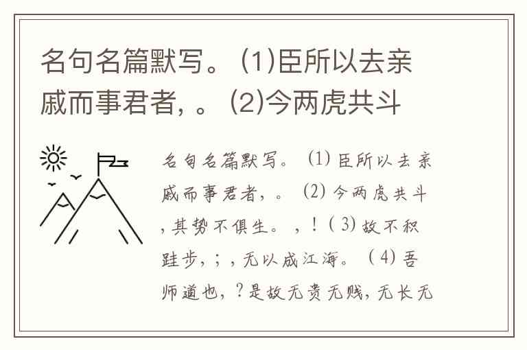 名句名篇默写。 (1)臣所以去亲戚而事君者, 。 (2)今两虎共斗,其势不俱生。 , ! ( 3)故不积跬步, ; ,无以成江海。 ( 4)吾师道也, ?是故无贵无贱,无长无少, , 。