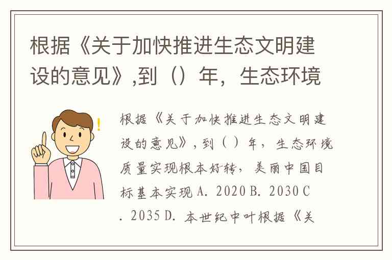 根据《关于加快推进生态文明建设的意见》,到()年,生态环境质量实现根本好转,美丽中国目标基本实现 A. 2020 B. 2030 C. 2035 D. 本世纪中叶