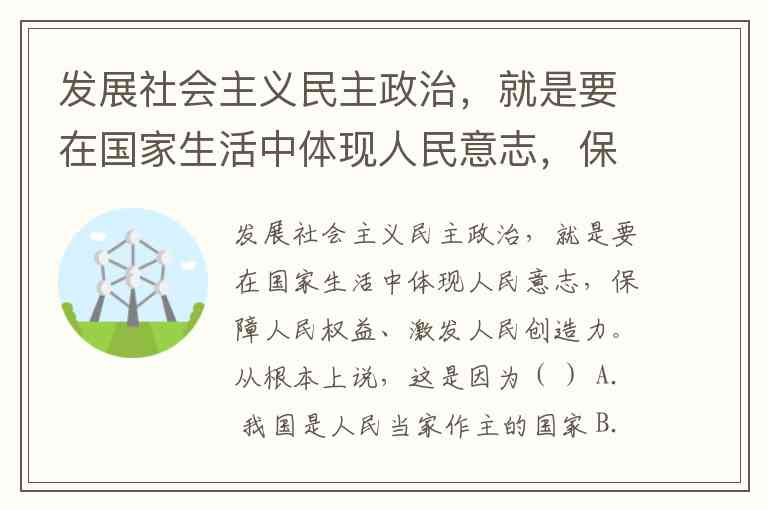 发展社会主义民主政治,就是要在国家生活中体现人民意志,保障人民权益、激发人民创造力。从根本上说,这是因为( ) A. 我国是人民当家作主的国家 B. 群众路线是党的根本领导方法 C. 宪法规定公民享有民主监督权 D. 我国人民享有最为广泛的民主权利