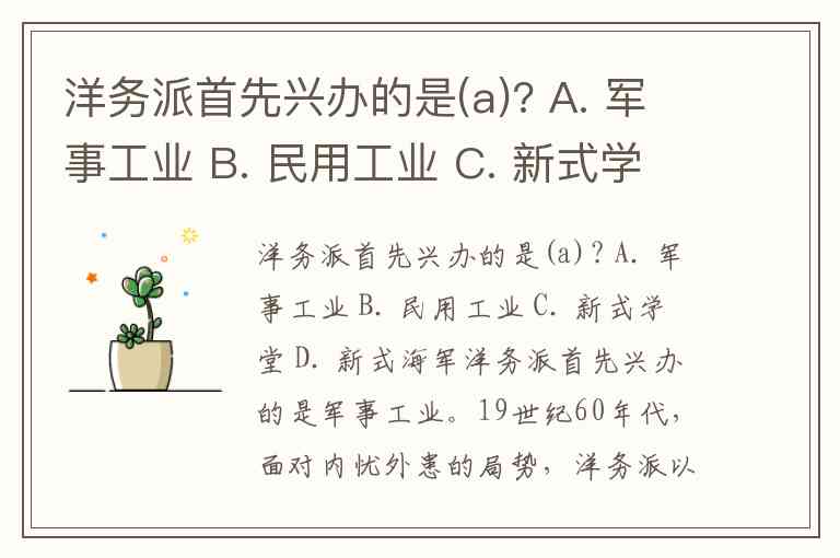 洋务派首先兴办的是(a)? A. 军事工业 B. 民用工业 C. 新式学堂 D. 新式海军