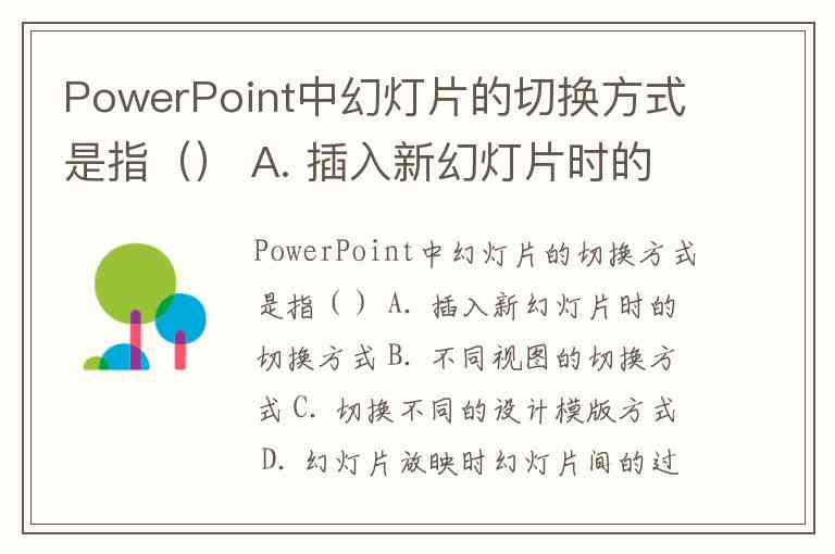 PowerPoint中幻灯片的切换方式是指() A. 插入新幻灯片时的切换方式 B. 不同视图的切换方式 C. 切换不同的设计模版方式 D. 幻灯片放映时幻灯片间的过渡形式