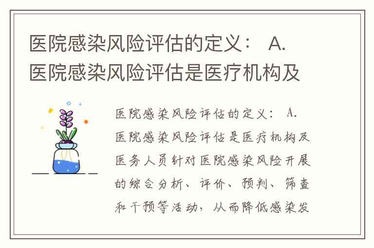 医院感染风险评估的定义需区分"概念内涵"与"具体分类"。选项A准确概括了其本质:医疗机构及医务人员针对感控风险开展的综合分析、评价、预判、筛查和干预等活动,从而降低感染发生风险的规范性要求,这与"对医院感染发生的可能性、危险因素、危害程度等进行系统调查、分析和评价的过程"的核心内涵一致。而选项B实际描述的是评估的种类划分,包括病例、病种、部门、机构层面及感染暴发等场景的评估类型。