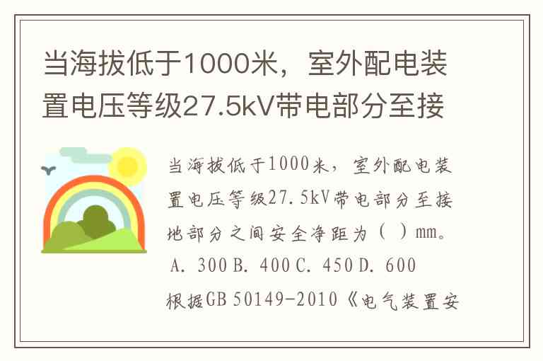 当海拔低于1000米,室外配电装置电压等级27.5kV带电部分至接地部分之间安全净距为( )mm。 A. 300 B. 400 C. 450 D. 600