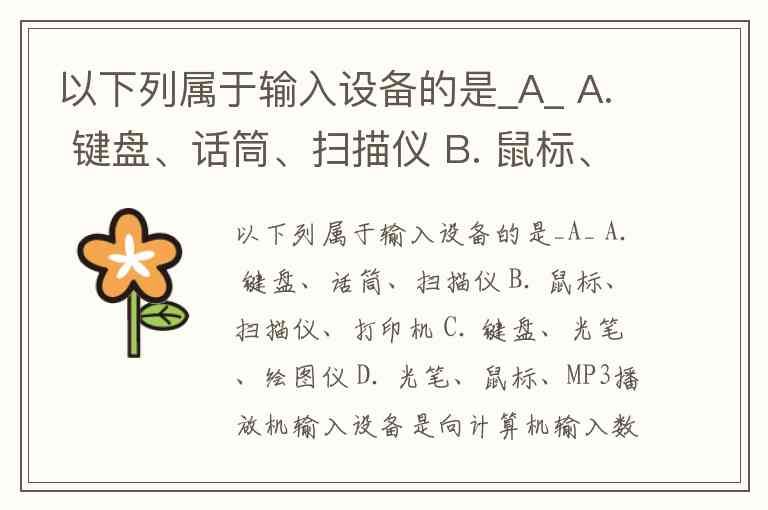 以下列属于输入设备的是_A_ A. 键盘、话筒、扫描仪 B. 鼠标、扫描仪、打印机 C. 键盘、光笔、绘图仪 D. 光笔、鼠标、MP3播放机