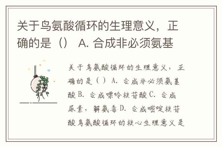 关于鸟氨酸循环的生理意义,正确的是() A. 合成非必须氨基酸 B. 合成嘌呤核苷酸 C. 合成尿素,解氨毒 D. 合成嘧啶核苷酸