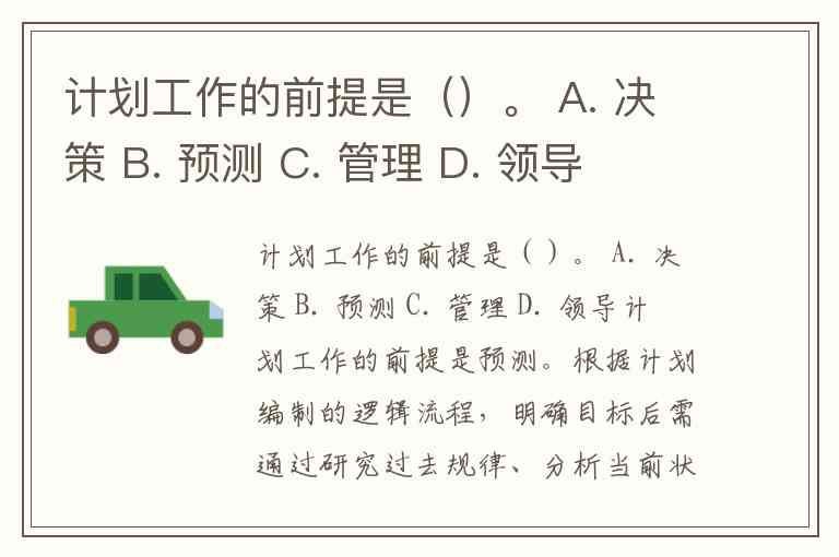 计划工作的前提是()。 A. 决策 B. 预测 C. 管理 D. 领导