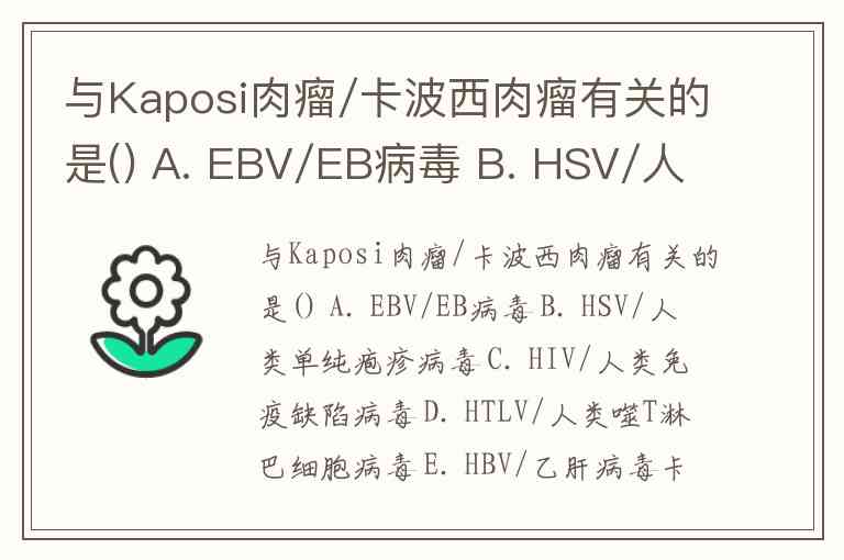 与Kaposi肉瘤/卡波西肉瘤有关的是() A. EBV/EB病毒 B. HSV/人类单纯疱疹病毒 C. HIV/人类免疫缺陷病毒 D. HTLV/人类噬T淋巴细胞病毒 E. HBV/乙肝病毒