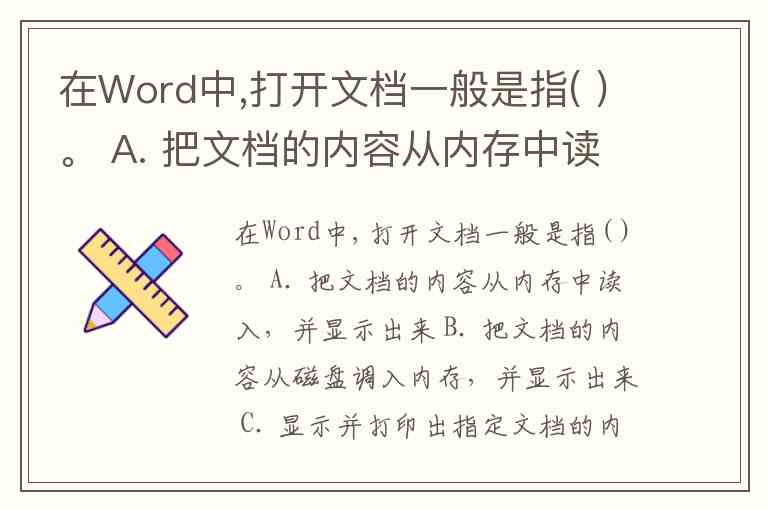 在Word中,打开文档一般是指( )。 A. 把文档的内容从内存中读入,并显示出来 B. 把文档的内容从磁盘调入内存,并显示出来 C. 显示并打印出指定文档的内容 D. 为指定文件开设一个新的、空的文档窗口